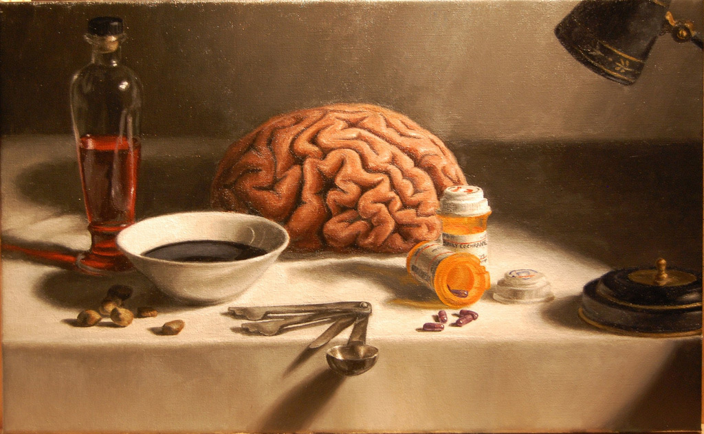 13" x 21". Oil on canvas. Summer 2009. This still life compares the Hippocratic and modern approaches to medicine. The four humors (blood, black bile, yellow bile, and phlegm) are represented by the vial of blood, dish of bile, gallstones, and brain, while modern medicine is represented by the pills and light lamp (used to treat seasonal affective disorder). While the details of the two medicinal systems are different, their structures are often similar in that both aim to create balance in the body -- whether by bleeding you because you have too much blood, or by giving you proton pump inhibitors to reduce gastric acid production.